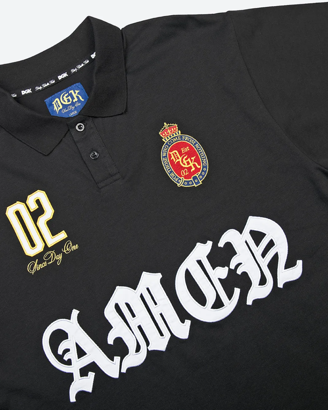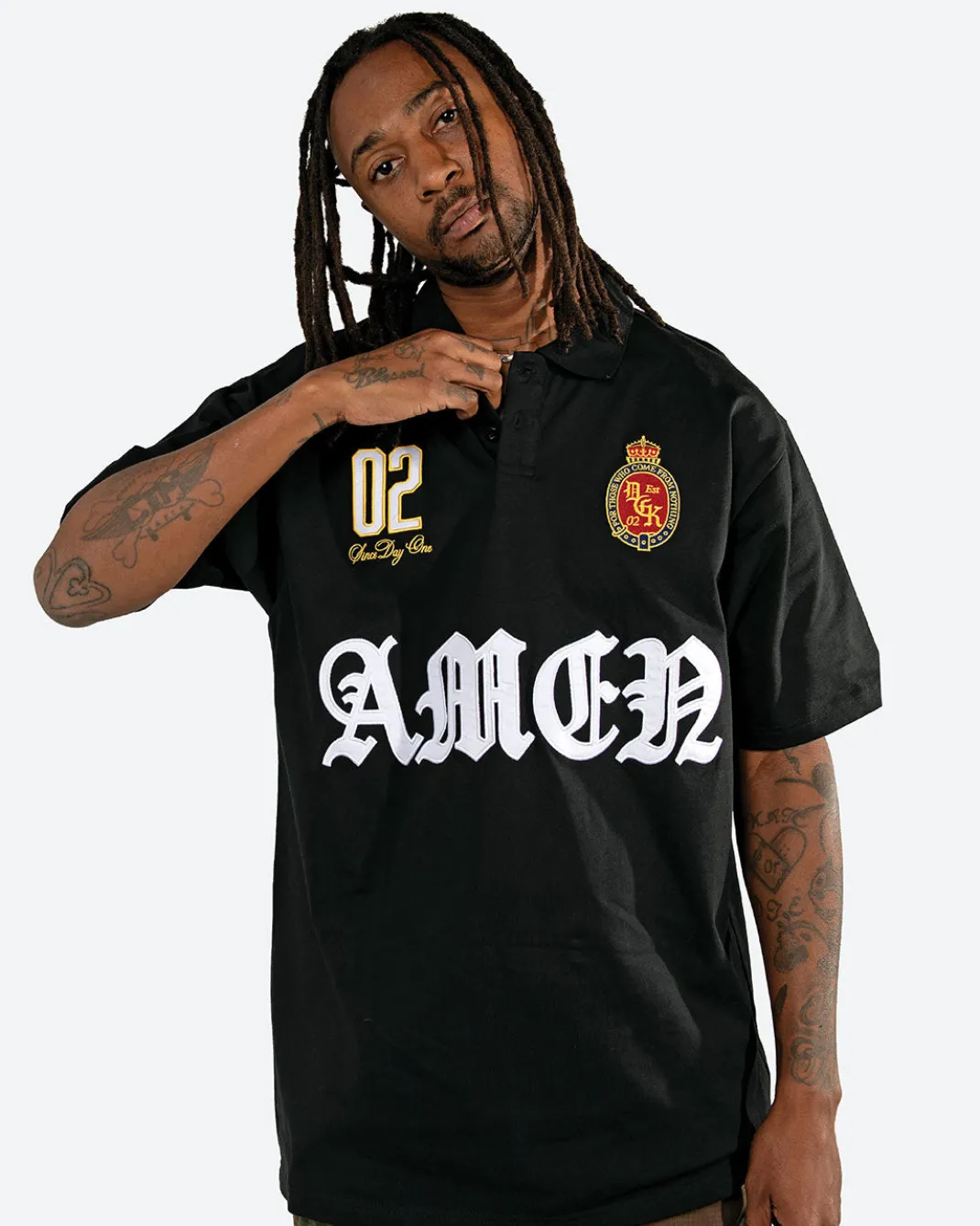 100% Cotton Jersey / Classic Fit / Three Button Placket / Dual Chest Pockets / Front Embroidery and Applique Art / Ribbed Collar