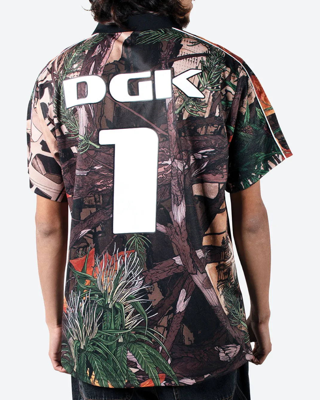 100% Poly Sport Knit / Custom Soccer Style / Collar over Slight V Neck / Tree Camo Sublimated Art / Silicone Applique / Piping Detail