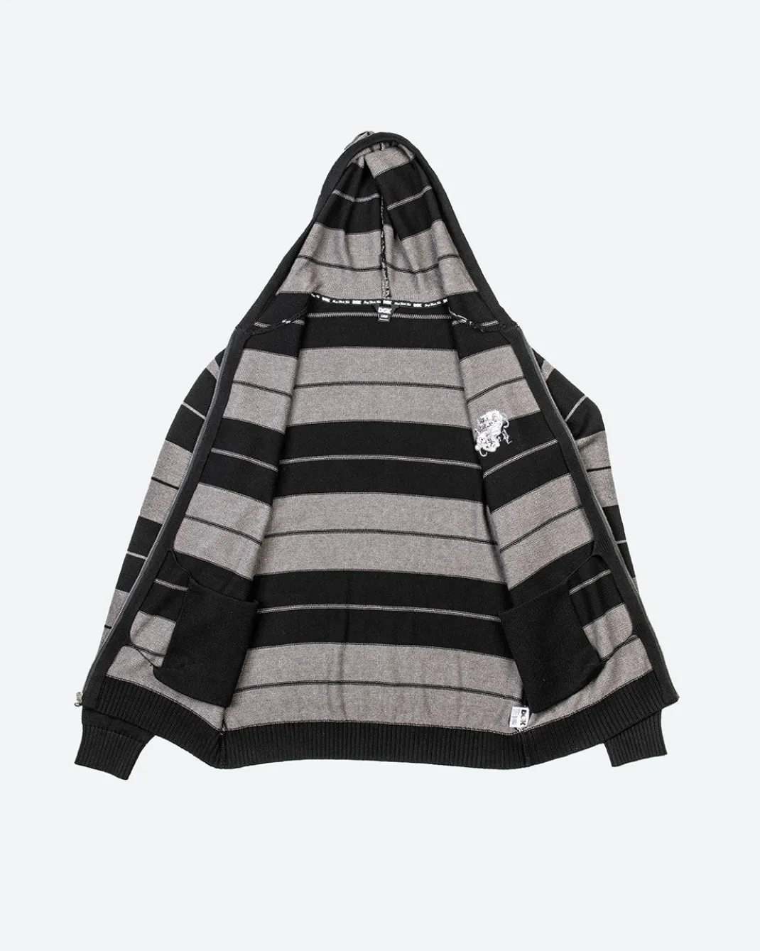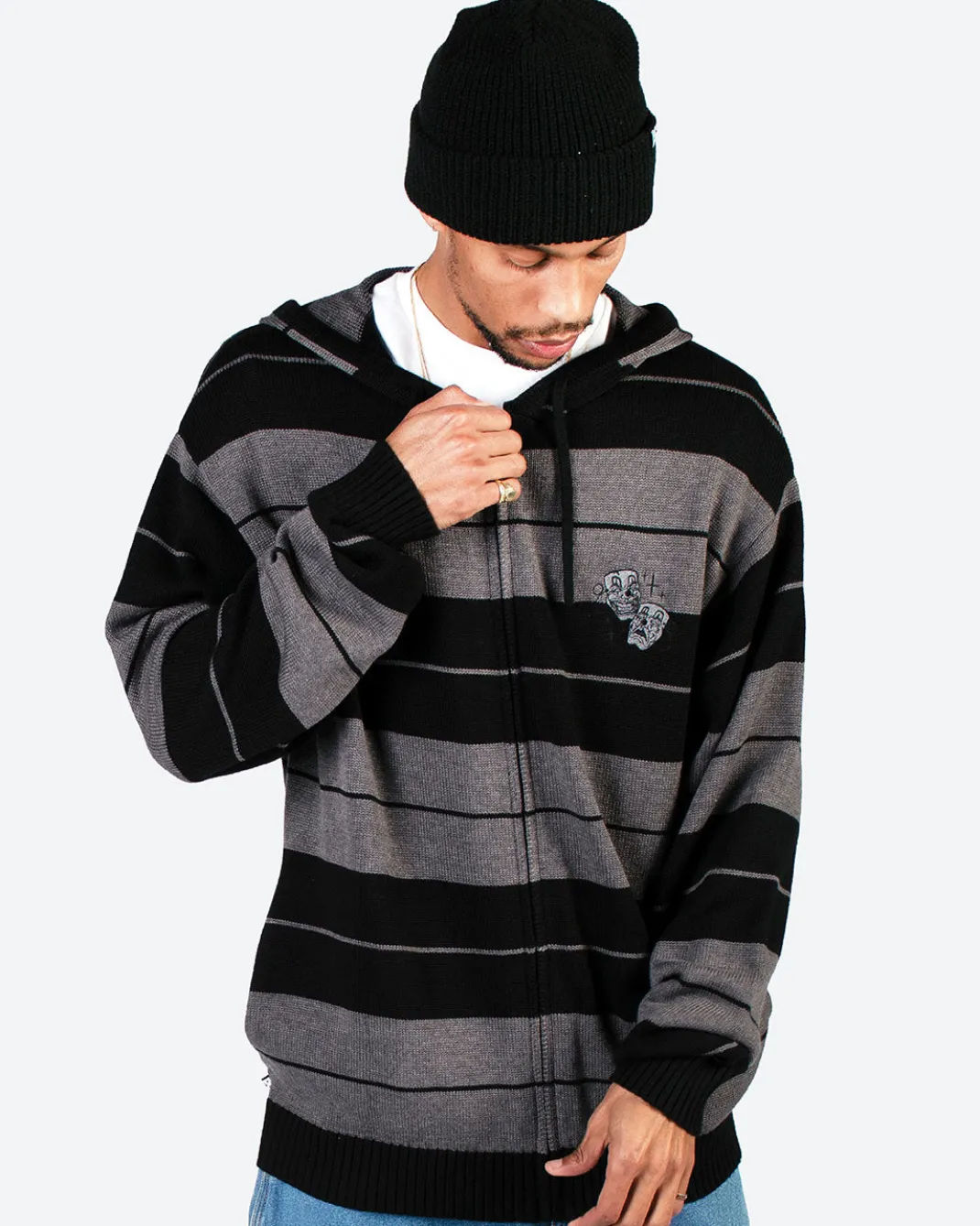 Heavy Weight 12 Guage Sweater Knit / Yarn Dye Stripes / YKK Front Zipper / Small Chest Embroidery Art / Lower Front Pockets / Elastic Cuffs and Hem / Drawcord Hood